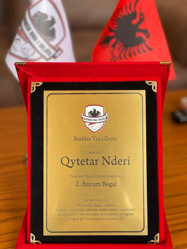 Pata nderin e veçantë, me miratim edhe të Këshillit Bashkiak Vau Dejës, t’i jepja titullin “Qytetar Nderi” i Vaut të Dejës, presidentit të Shqipërisë Sh.T.Z Bajram Begaj. Me motivacionin “Intelektual i shquar, bartës i vlerave intelektuale e qytetare, shtetar i ekuilibruar, korrekt e i paanshëm! Për vëmendjen, dashamirësinë e miqësinë e treguar për Vaun e Dejës e banorët e tij”- Presidenti Begaj nga sot ka me vete një copëz të qytetit tonë Presidenti Begaj ka ndërmarrë disa nisma në ndihmë të shëndetit dhe mirëqeniës së banorëve të Vaut të Dejës siç është edhe projekti pilot i mamografisë lëvizëse në zonat thella. I jemi mirënjohës dhe ndihemi të sigurtë për të vijuar punët e mira për komunitetin tonë!